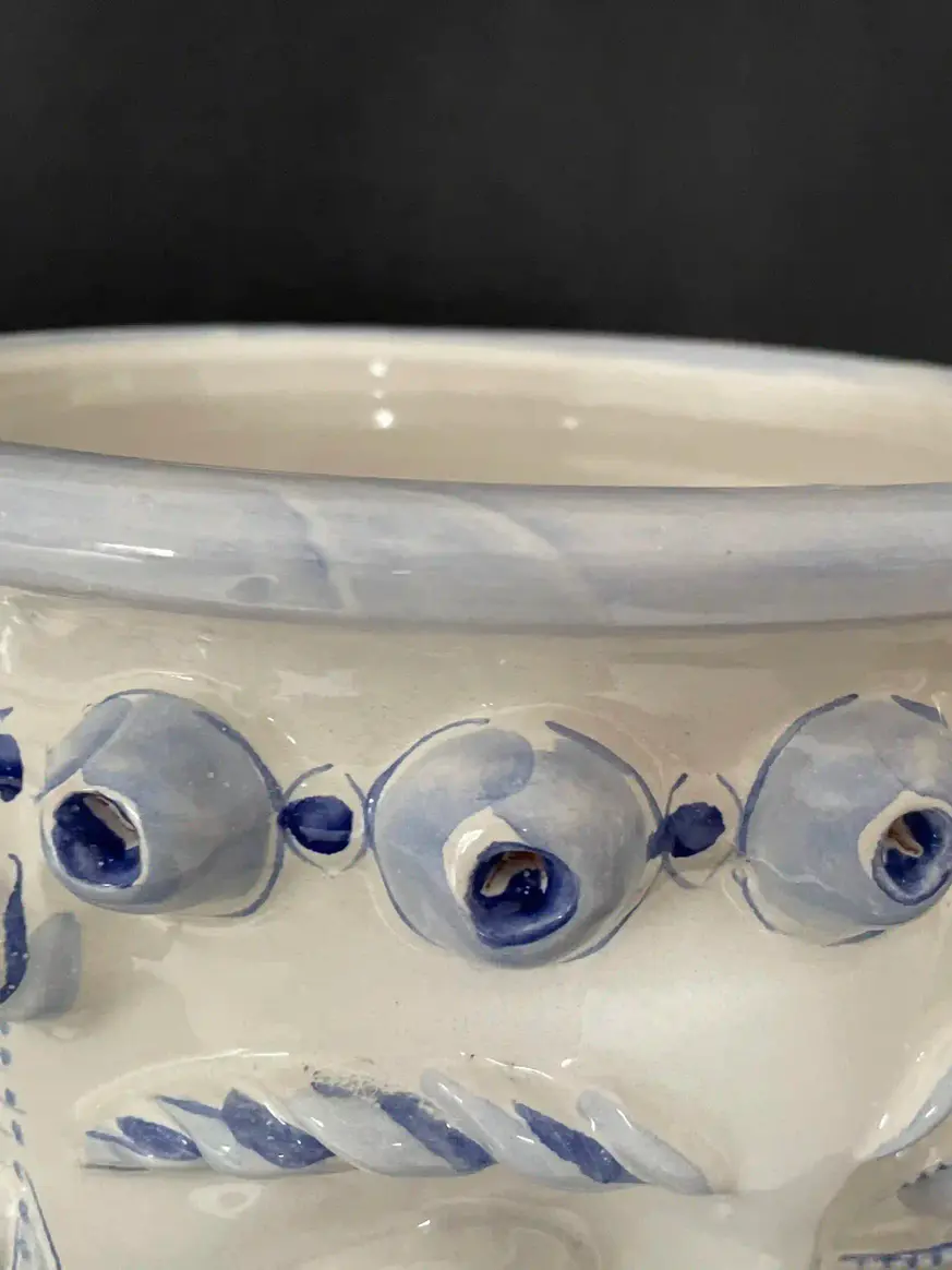A sculptural ceramic vase inspired by the iconography of Norman queens in Sicily. Lustrous white glaze provides the base for intense, hand-brushed cobalt blue oxides, creating crisp contrasts that bring definition to the facial features and crown. Entirely hand-finished.